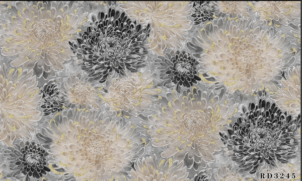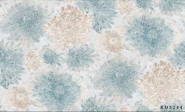 Bloom Aura wallpaper features lush, detailed chrysanthemum patterns in calming pastel blues, elegant creams, soft golds, and striking blacks, bringing life and sophistication to any space. This design creates a gentle yet vibrant statement wall, perfect for both modern and classic interiors such as bedrooms, living rooms, or lounges. The durable and easy-to-clean surface ensures long-lasting beauty, making Bloom Aura an ideal choice for stylish homes that want to showcase florals with a serene, contemporary flair
