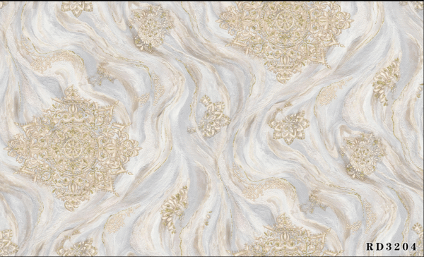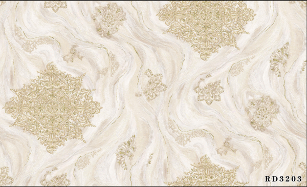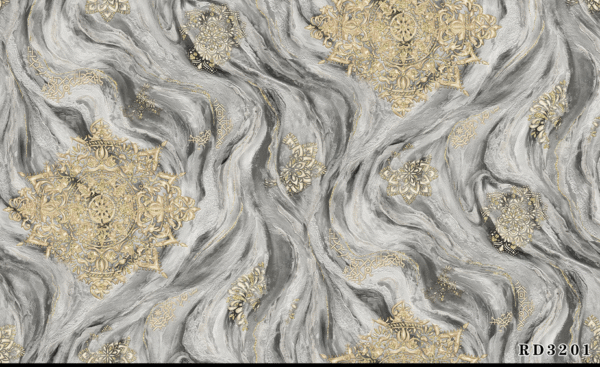 Royal Lace wallpaper features intricate lace-inspired gold patterns flowing over soft cream, white, and blue marbled backgrounds, creating an elegant and regal statement for any room. Perfect for living rooms, bedrooms, or dining areas, this wallpaper blends classic luxury with contemporary style to instantly enhance your walls while remaining easy to maintain and durable for daily use